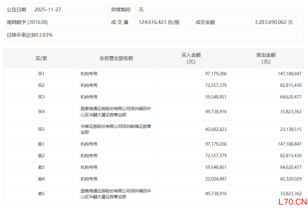 南网数字:全天换手率达53.03%配资开户流程出金方便吗,4机构合计净卖出8863.48万元