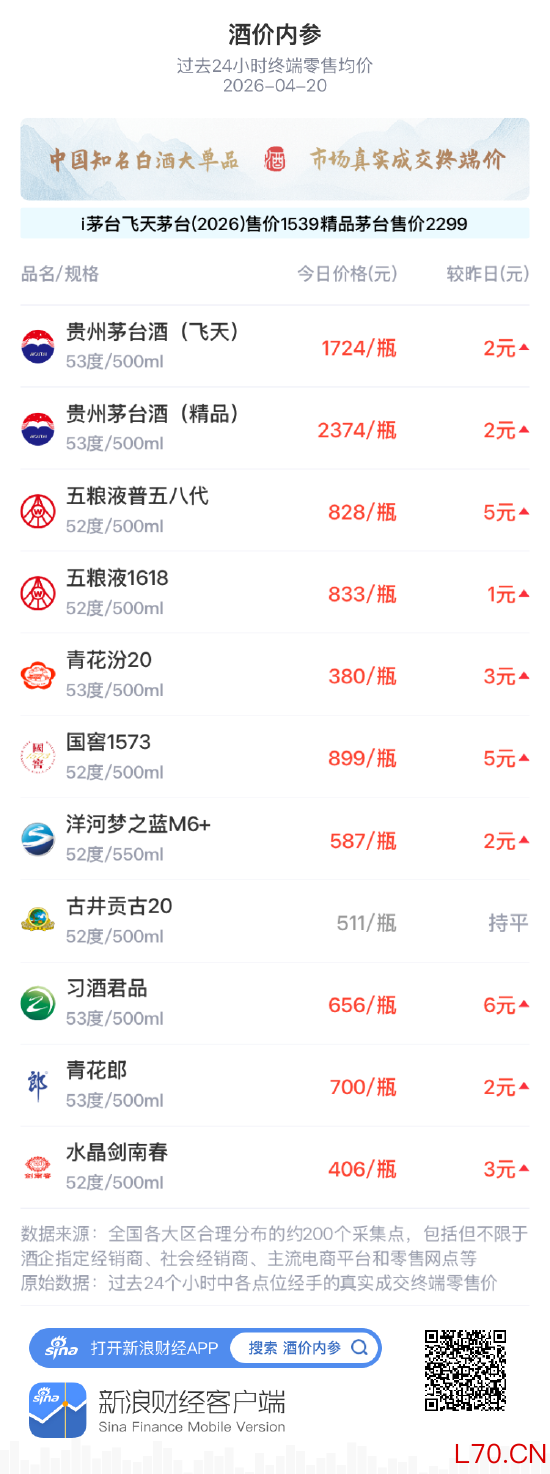 新浪财经“酒价内参”过去24小时收集的数据显示,中国白酒市场主要单品的终端零售均价在4月20日整体明显回升。如果主要单品各取一瓶整体打包售卖,今日总售价为9898元,较昨日上涨31元,升至近九日最高位。市场在昨日回落后明显修复,终端交投情绪显著改善。