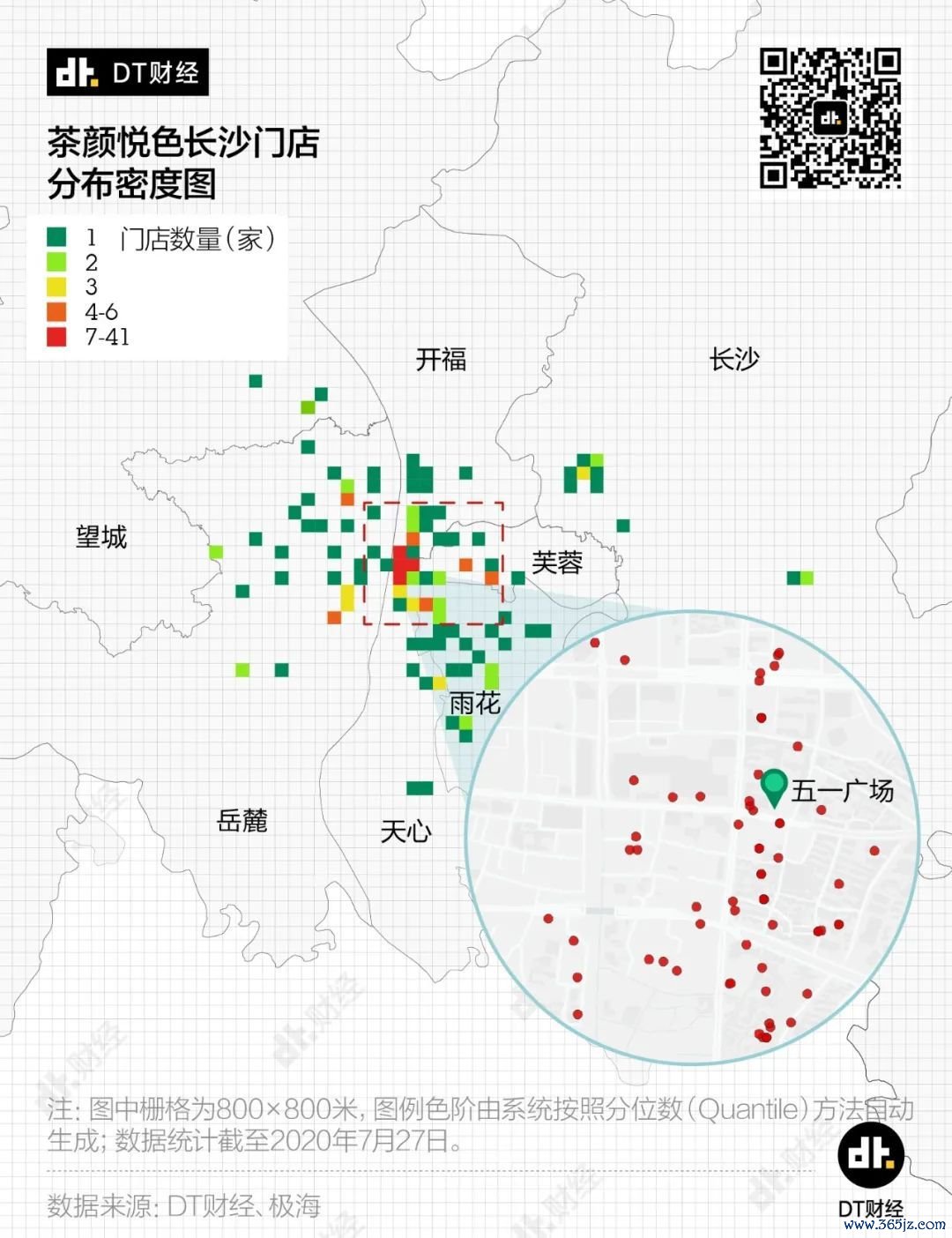 结果发现,一方面1點點在长沙的门店总数不算太多,只有百来家,所以显示在地图上的色块并不多。另一方面,就算在市中心五一广场附近,1點點也只有在2个小方格的门店数量达到了4家。与茶颜悦色的41家相比,1點點在长沙并不那么有存在感。