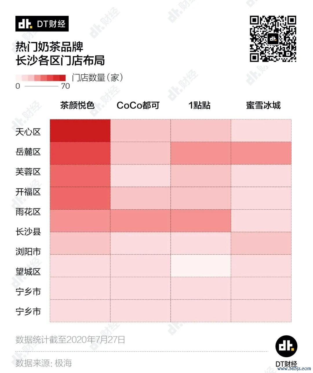 单从门店数量来看,截至2020年7月27日,茶颜悦色在长沙有225家门店,是CoCo和1點點的2.2倍,蜜雪冰城的2.7倍。
