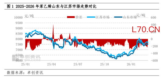 2月中国苯乙烯价格呈现先涨后跌再涨的趋势。月内价格高位走弱,整体下跌时间长,月初、月下旬价格有所上涨。驱动逻辑在市场对基本面预期与现实间强弱转换,表现纠结。截至2月28日,江苏苯乙烯收盘月均价在7688.13元/吨,环比上涨4.03%,山东苯乙烯收盘月均价在7524.38元/吨,环比上涨4.82%。月内山东持续贴水江苏市场,但两地套利窗口阶段性开启,两地货源流动性较1月份降低,与预测基本一致。华东-山东价差先收窄再扩大,最大值在2月26日的240元/吨,最小值在2月2日的65元/吨。