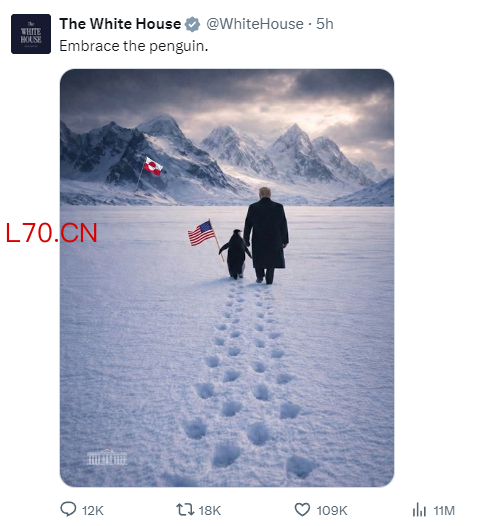 白宫发布特朗普与企鹅走向格陵兰岛AI图片