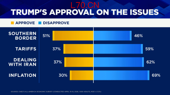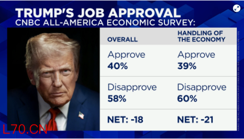CNBC 全美经济调查显示,全美 40% 民众认可总统唐纳德・特朗普的整体执政表现。 受伊朗战争引发的汽油价格飙升影响,特朗普净支持率下滑 10 个百分点至 -18%,创其2届任期内最低纪录。 特朗普在经济议题上的净支持率降至 -21%,同样为其总统任期内的最低值。最新 CNBC 全美经济调查显示,美国总统唐纳德・特朗普的整体与经济支持率大幅跳水,这显然是民众普遍不满对伊朗战争、高油价及负面经济观感的直接后果。
