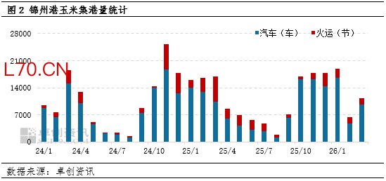 锦州港玉米集港量反映了东北产区供应量变化。受春节假期影响,一季度锦州港玉米集港呈“V”型走势。卓创资讯统计数据显示,2026年1-2月锦州港总集港量共25268车(节),同比减少22.67%,春节后集港量增长明显,截至3月13日,锦州港3月集港量汽运共9673车,同比增加73.1%,火运共1610节,同比下降48%,总集港量约95万吨,同比增长63%。其中,单日汽运集港量最高达到980车,创近五年同期最高纪录,主要原因是锦州港收购价格持续上涨且有一定优势。