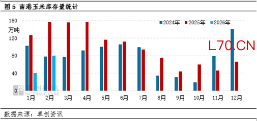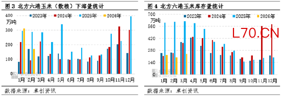 由于南方市场玉米存刚需支撑,北港玉米下海量较稳定。卓创资讯监测数据显示,2026年1-2月北方六港玉米(散粮)下海量共约482.69万吨,较去年同期下降16.9%,且降幅小于同期集港降幅,所以北港库存下降。从图中可看出,今年1-3月份北港库存维持在170万-190万吨,处于近四年同期最低值。这是产区供应和销区需求共同作用的结果。