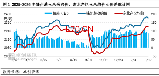 2026年以来,锦州港玉米收购价格整体呈上涨趋势。卓创资讯监测数据显示,截至3月17日,锦州港水份15%、容重700g/L玉米收购主流价2360-2370元/吨,较1月初涨幅4.41%。从图中可看出,1-3月份,锦州港收购价高出东北产区均价80-105元/吨,基本能覆盖汽运费用,即产区贸易环节发锦州港的即期利润非常有限,部分贸易企业消化前期低价库存。