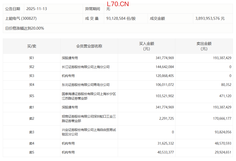 上能电气今日20cm涨停,2家机构专用席位净买入1.31亿元