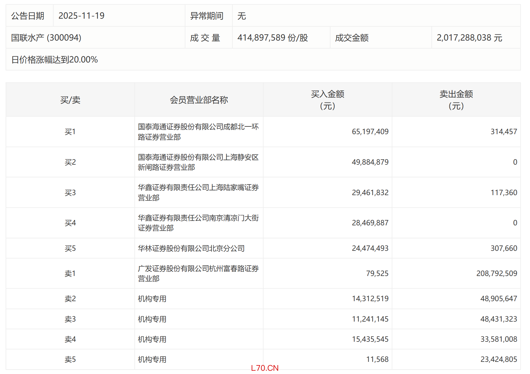国联水产今日20%涨停,4家机构专用席位净卖出1.13亿元