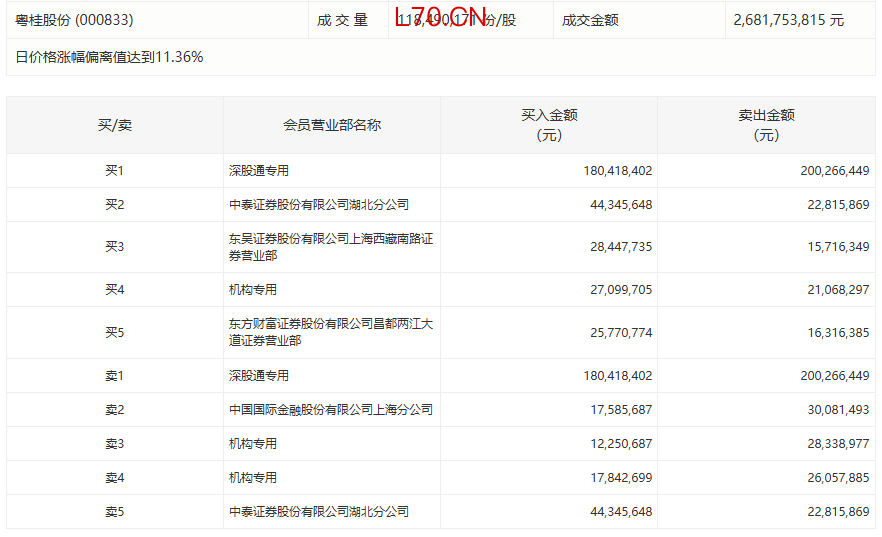 粤桂股份今日涨停 深股通席位买入1.8亿元并卖出2亿元