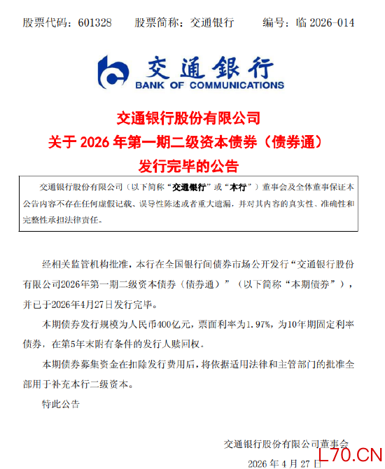交通银行:400亿元二级资本债券(债券通)发行完毕